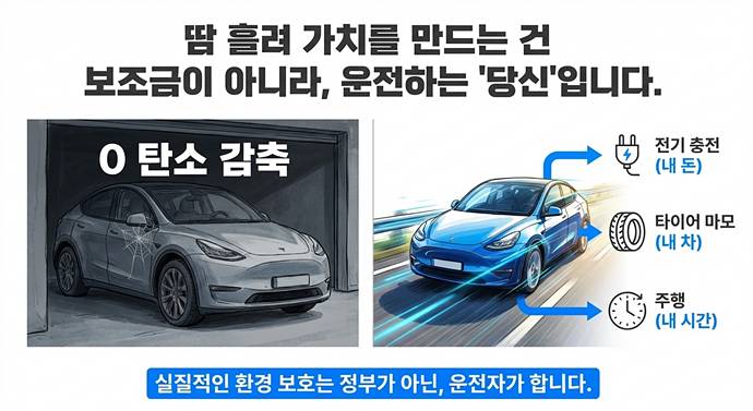 탄소 감축은 차량을 ‘사놓는 행위’에서 발생하지 않는다. 전기를 충전하고, 도로 위를 실제로 달릴 때 비로소 숫자로 계량된다. 충전 요금은 운전자가 낸다. 주행 거리는 운전자의 시간과 노동에서 나온다. 감가상각과 유지비도 개인이 부담한다.
