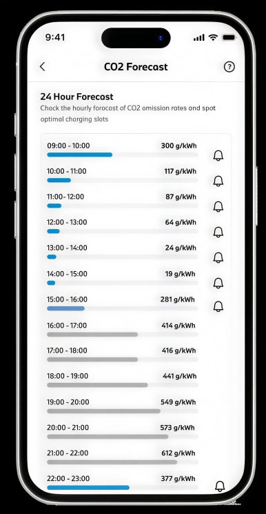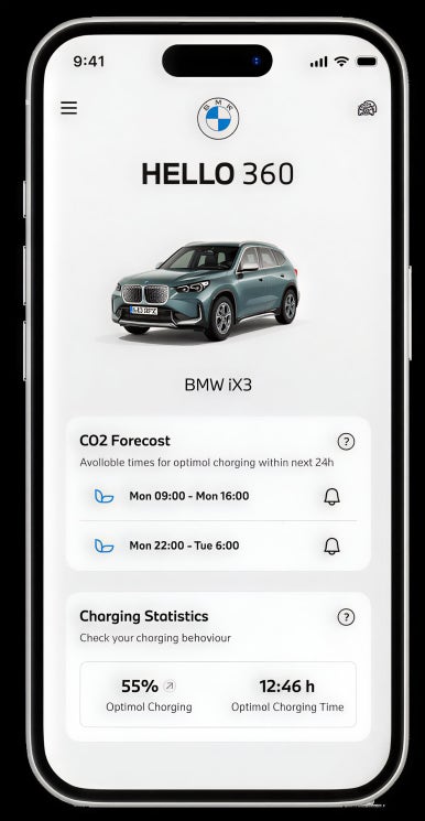 BMW는 앱을 통해 실시간으로 전력 생산 과정의 탄소 배출량을 보여주고, 탄소 배출이 적은 시간대에 알림을 보냈습니다.