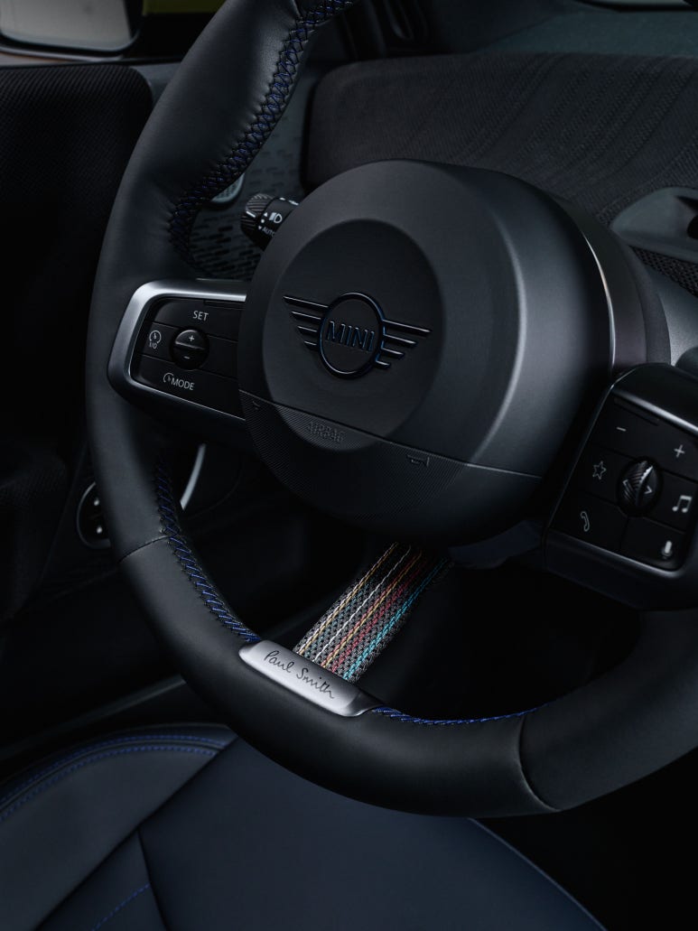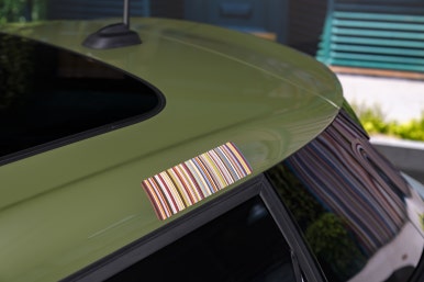 가장 인상적인 부분은 역시 지붕, 루프 디자인입니다. 운전석 쪽 후면에 폴 스미스의 상징인 시그니처 스트라이프가 들어가 있습니다. 멀리서 봐도 어 저거 폴 스미스네 라고 알아볼 수 있는 확실한 포인트입니다. 검은색 소프트탑이 적용된 컨버터블 모델을 제외하고 3도어와 5도어 모델에서 이 감각적인 지붕을 만날 수 있습니다.