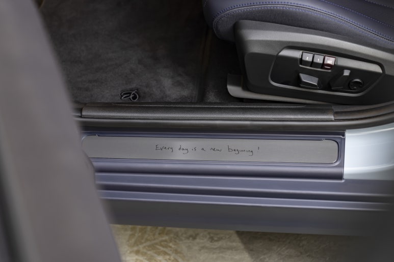 실내로 들어가면 디테일의 향연이 펼쳐집니다. 문을 열자마자 바닥에 헬로(Hello)라는 조명이 비치는데, 이는 폴 스미스가 직접 쓴 손글씨입니다. 차에 탈 때마다 마치 오랜 친구가 인사를 건네는 듯한 기분이 들게 하죠. 도어 실에는 매일은 새로운 시작이다(Every day is a new beginning)라는 문구가 적혀 있어, 운전대를 잡을 때마다 긍정적인 에너지를 얻게 됩니다.