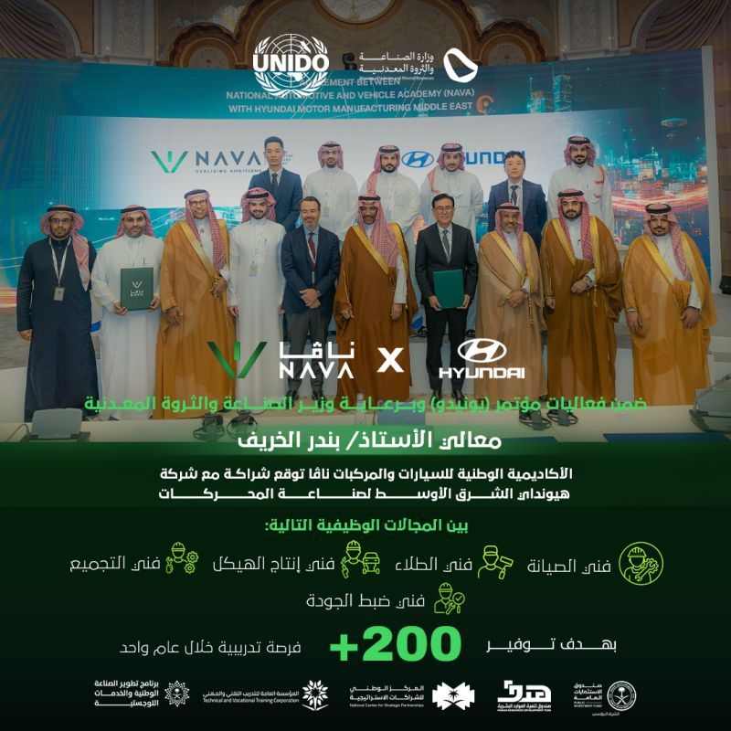 2일 사우디 국영 자동차·차량 아카데미(NAVA)에 따르면 현대차 중동·아프리카지역본부는 최근 사우디아라비아 리야드에서 열린 유엔산업개발기구(UNIDO) 제21차 총회에서 사우디 인적자원개발기금(HRDF·Hadaf)·NAVA와 전략적 3자 파트너십을 체결했다. 이번 파트너십은 총 6800만 리얄(약 274억원) 이상을 투입해 사우디 국민 총 356명을 전기차 및 첨단 전자 장비 산업 전문가로 육성하는 대규모 인재 양성 프로그램의 일환이다.