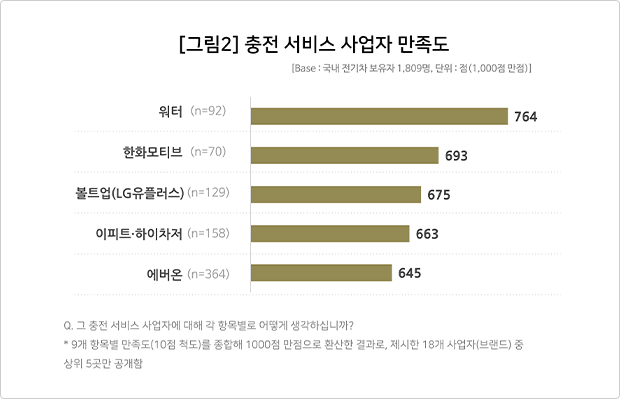 ● 충전 사업자 만족도 1위는 ‘워터’…9개 항목 중 8개 1위