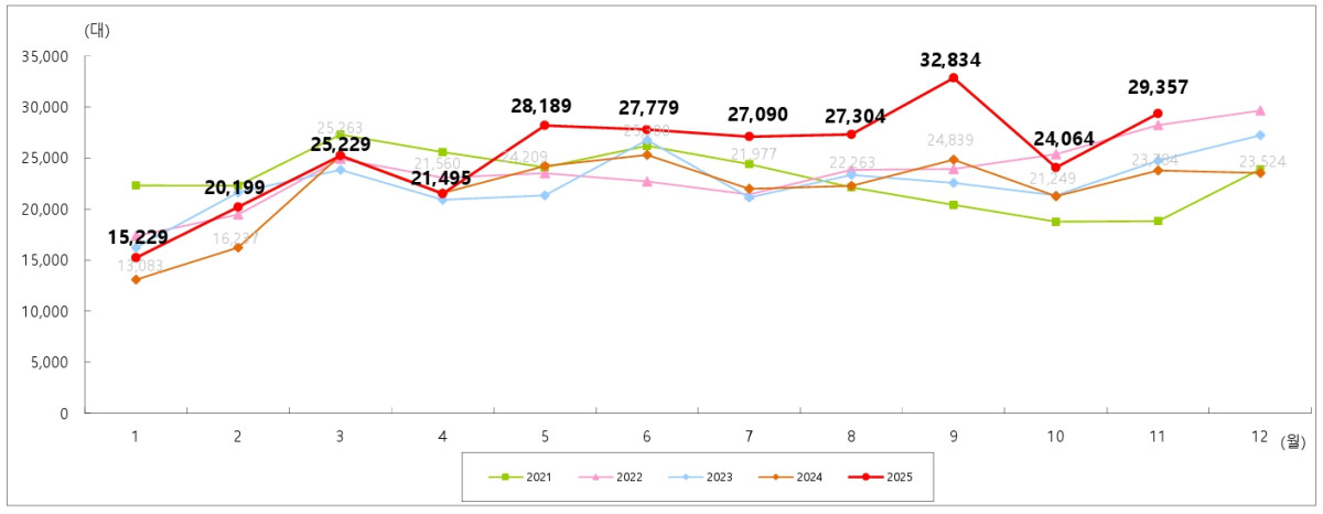 11월 국내 수입 승용차 신규등록이 2만9357대로 집계됐다. 추석 연휴에 따른 10월 기저효과와 브랜드별 판촉 강화가 맞물리며 전월 대비 22% 증가했다.