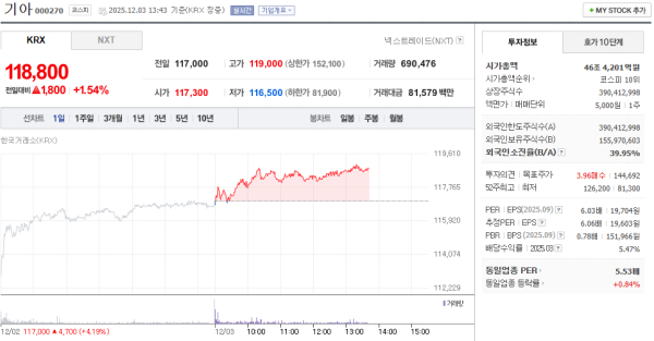 기아, 12월 3일 장중 118,800원 거래대금 815억 7,900만 원