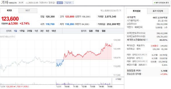 기아 주가 12월 5일 123,600원 2.74% 상승 마감