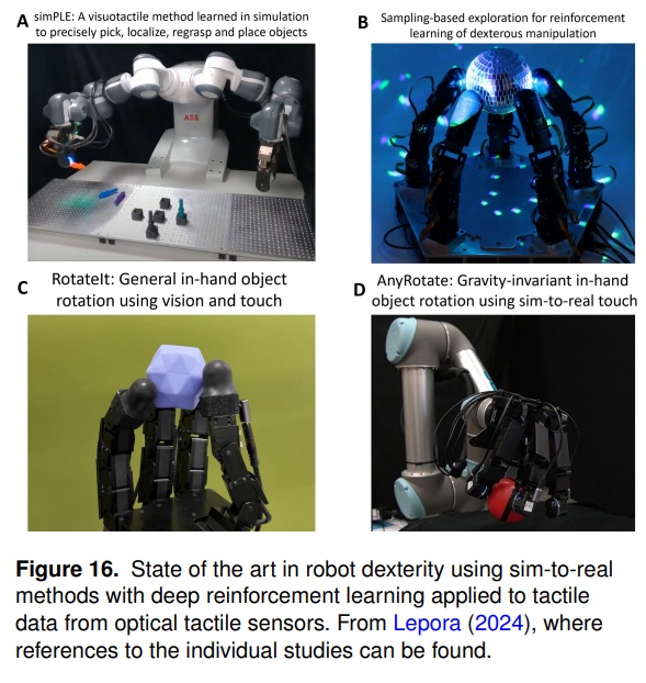 최근 이 분야는 다중 손가락 로봇 손을 사용한 손안 물체 조작의 여러 시연과 함께 단계적 변화를 겪었다. 이러한 모든 손은 손가락 끝에 고해상도 촉각 센싱을 사용했으며, 이는 유세프 등의 의견과 일치한다. 또한 물리 시뮬레이션에서 심층 강화학습을 통해 훈련된 촉각 제어의 변형을 사용했다. 시뮬레이션에서 많은 물체를 접함으로써 안정적인 파지를 유지하면서 새로운 물체를 조작하는 방법을 학습한다.