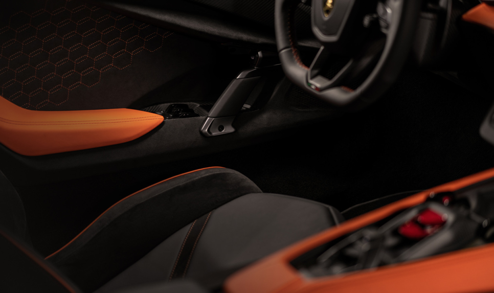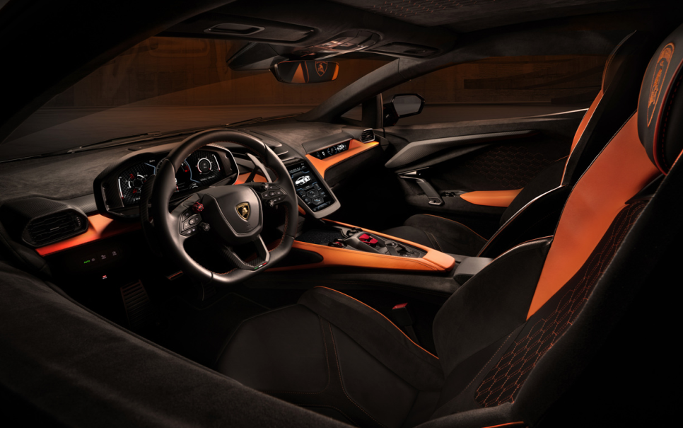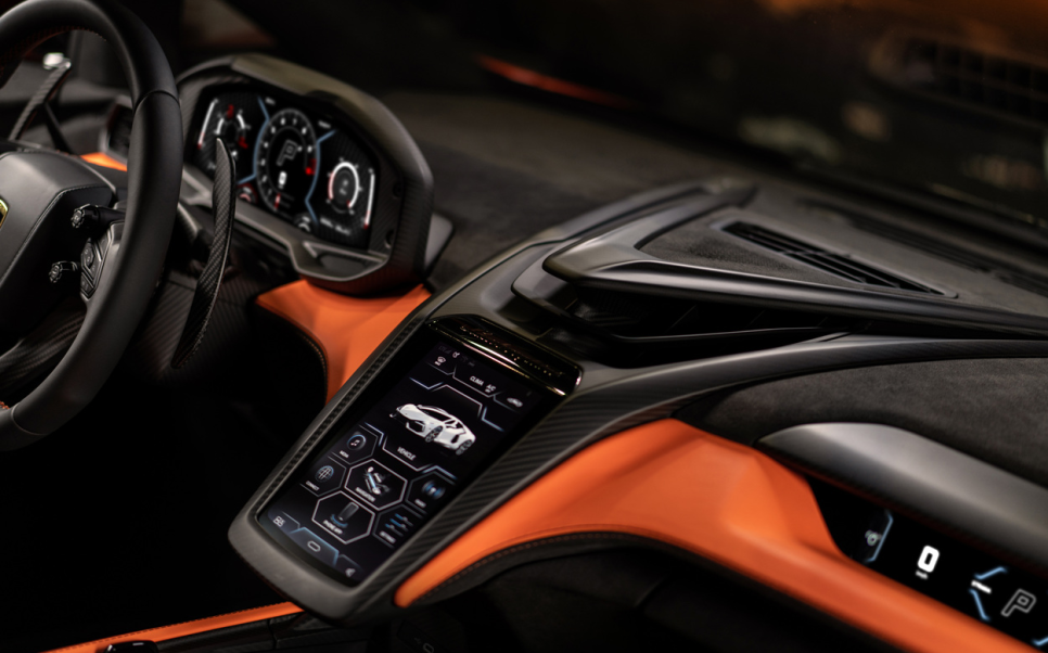 람보르기니 레부엘토의 실내디자인은 전통적인 람보르기니의 투박한 레이아웃에서 벗어나 미래지향적인 디지털 인터페이스 중심의 구조로 재구성되었습니다 중앙 12.3인치 클러스터를 통해 필요한 정보를 직관적으로 확인할 수 있고 조수석에는 별도의 9.1인치 디스플레이가 적용되어 주행 정보 공유 경험을 제공합니다. 확실히 현대적인 인테리어 구성을 잘 갖추고 있죠.