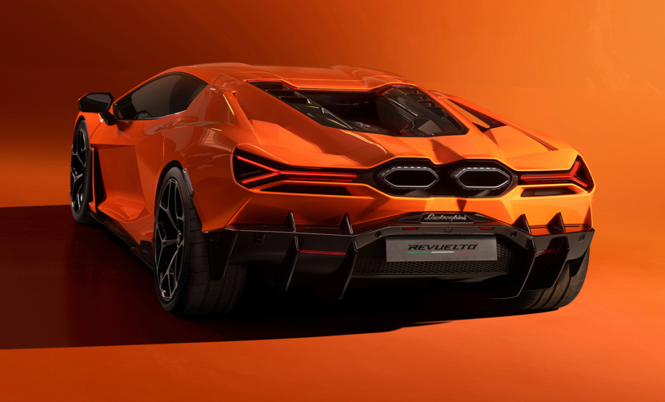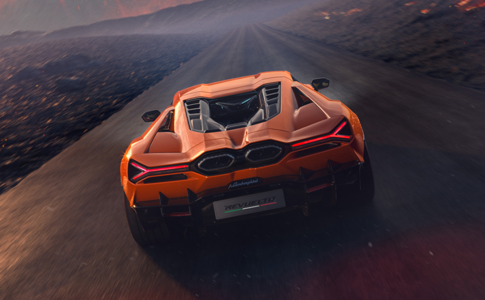 람보르기니 레부엘토의 외관 디자인은 람보르기니가 지향하는 미래적 감성과 전통적인 육각형 디자인 DNA를 완벽하게 결합하고 있습니다. 전면부는 낮고 공격적인 Y 시그니처 LED가 배치되어 있고 차체의 공기 흡입구와 에어로 채널은 전기모터 냉각 및 고속 안정성을 극대화하도록 정교하게 설계되어 있어 실용성과 예술적 완성도를 동시에 갖추고 있습니다.
