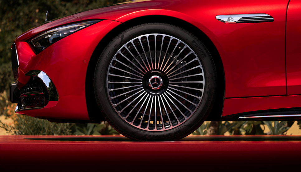 휠은 21인치 마이바흐 멀티 스포크 휠이 기본으로 들어가는데요. 조금 더 고급스러운 느낌의 5홀 단조 휠은 선택 사양으로 적용하실 수 있습니다. 그리고 측면부에는 마이바흐 문양이 들어간 고광택 크롬의 프론트 휀더 가니쉬와 사이드 실에는 마이바흐 전용 디자인 요소들이 적용되면서 한층 더 고급스러운 측면 모습을 보여주고 있죠.