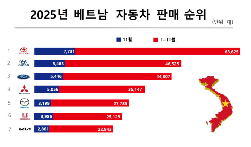 현대차와 베트남 양강구도를 형성했던 토요타는 11월 동안 전년 동기 대비 11% 줄어든 7731대를 판매했다. 현대차를 턱킽에서 추격하고 있는 포드의 경우 전년 동기 대비 3% 감소한 5446대를 판매했다.