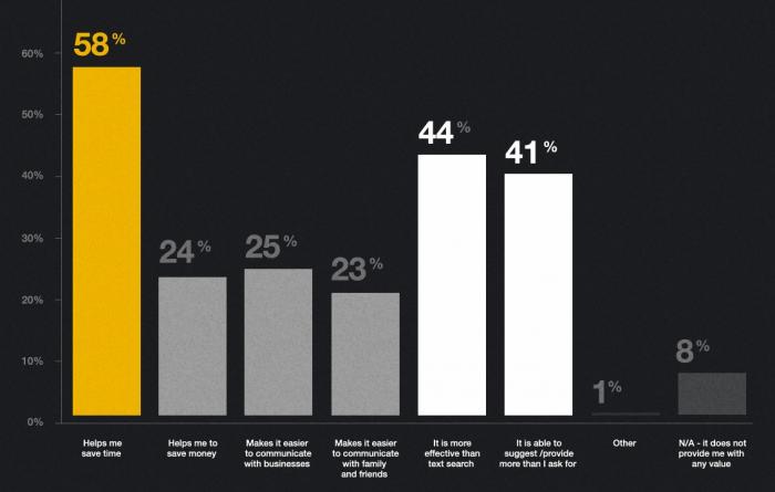 효과성 측면에서는 44%가 AI가 기존 텍스트 검색보다 더 효과적이라고 평가했으며, 41%는 AI가 요청한 것 이상을 제안하거나 제공할 수 있다고 답했다. 비즈니스나 가족·친구와의 소통을 용이하게 한다는 응답은 각각 25%와 23%로 상대적으로 낮았다. 8%는 AI가 전혀 가치를 제공하지 않는다고 답했으며, 1%는 기타 가치를 언급했다.