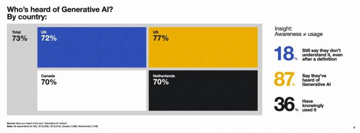 조사에 따르면 응답자의 87%가 생성형 AI에 대해 들어봤다고 답했지만, 정의를 제공받은 후에도 18%는 여전히 이해하지 못한다고 응답했다. 실제로 생성형 AI를 의도적으로 사용해 본 사람은 36%에 그쳤다. 이는 AI에 대한 높은 가시성이 실제 이해도나 활용으로 이어지지 않고 있음을 보여준다. 미국은 77%로 가장 높은 인지도를 기록했으며, 영국 72%, 캐나다와 네덜란드는 각각 70%를 나타냈다.