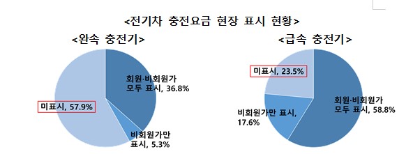 완속 충전기를 운영하는 19개 사업자 중 57.9%(11개)는 충전기에 요금을 표시하지 않았고, 급속 충전기를 운영하는 17개 사업자 중에서도 23.5%(4개)가 요금 게시를 하지 않았다.