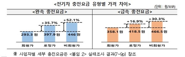 완속 충전요금을 20개 사업자 기준 평균값으로 비교하면 회원가가 293.3원/kWh로 가장 저렴했지만, 로밍가는 397.9원/kWh, 비회원가는 446원/kWh로 가장 비쌌다.