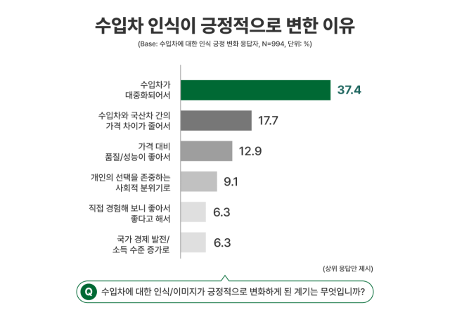 인식 변화의 주요 요인은 ‘수입차의 대중화’가 37.1%로 가장 높은 비율로 집계됐다. ‘국산차와의 가격 차이 축소’(17.7%), ‘가격 대비 품질·성능 개선’(12.9%) 등이 뒤를 이었다.