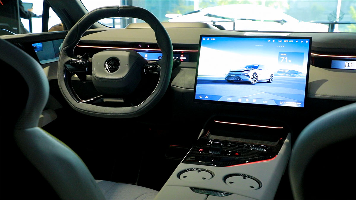 실내에는 55인치 증강현실 헤드업 디스플레이와 15.1인치 HD OLED 센터 디스플레이가 적용된다. 인포테인먼트 시스템은 언리얼 엔진 기반의 로터스 하이퍼 OS를 통해 구현했으며, 직관적인 조작과 빠른 반응성을 강조했다. 영국 프리미엄 오디오 브랜드 KEF와 공동 개발한 사운드 시스템을 적용해 돌비 애트모스 기반 3D 서라운드 사운드를 지원한다.