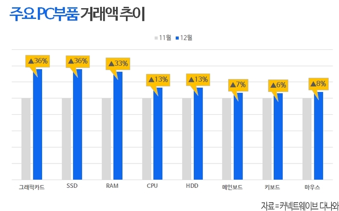 다나와 데이터에 따르면 12월 PC 부품 거래액은 전월 대비(MoM) 23% 상승했다. 특히 메모리 반도체 가격 상승의 직접적인 영향권에 있는 솔리드스테이트드라이브(SSD)와 RAM 거래액은 각각 전월 대비 약 36%와 33% 올랐다. 가격 단가가 높은 그래픽카드도 약 36% 상승폭을 보였다.