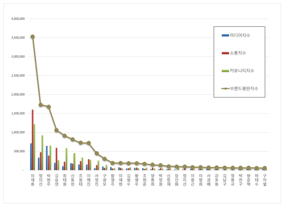 CEO 브랜드평판 1위를 기록한 삼성 이재용 브랜드는 미디어지수 712,013, 소통지수 1,599,083, 커뮤니티지수 1,215,085로 브랜드평판지수 3,526,181을 기록했다. 이는 지난 12월 브랜드평판지수 5,230,738과 비교해 32.59% 하락한 수치다.