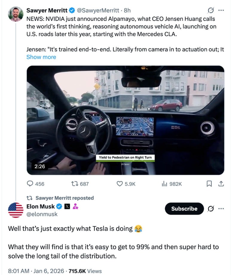 테슬라 CEO 일론 머스크가 소셜 미디어 엑스(X)를 통해 엔비디아가 선보인 차세대 자율주행 플랫폼 알파마요(Alpamayo)에 대해 부정적인 견해를 드러냈다. 머스크는 엔비디아의 자율주행 기술 진출이 테슬라의 FSD(Full Self-Driving) 사업에 위협이 될 것인지 묻는 질문에 실제 세계에서 발생하는 수많은 예외 상황인 긴 꼬리(Long-tail) 문제를 해결하는 것은 믿을 수 없을 만큼 어렵다고 지적했다. 이는 엔비디아가 제시한 기술적 로드맵이 실질적인 도로 주행의 복잡성을 완벽히 극복하기 어렵다는 시각을 드러낸 것이다.