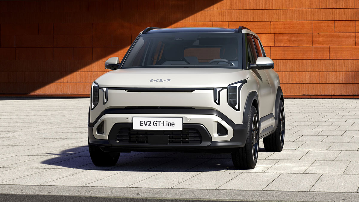 EV2는 전장 4060mm, 전폭 1800mm, 전고 1575mm의 크기를 갖췄다. 외관은 기아의 디자인 철학인 ‘오퍼짓 유나이티드’를 반영해 소형 SUV임에도 견고한 인상을 주게끔 디자인했다. 전면부는 세로형 헤드램프와 스타맵 시그니처 라이팅을 배치해 기아 패밀리룩인 타이거 페이스를 구현했으며, 측면은 입체적인 펜더 디자인과 기하학적 휠 아치로 볼륨감을 살렸다.