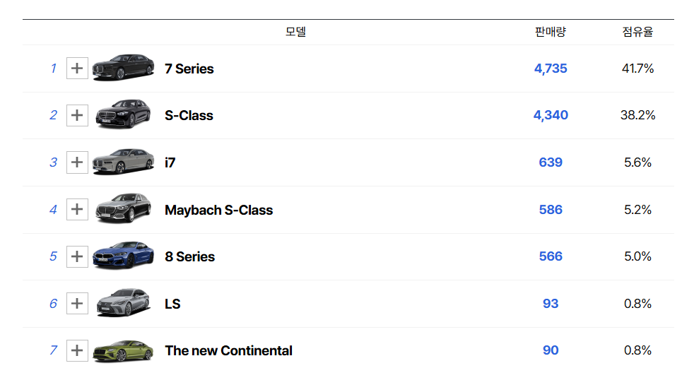 2025년 연간 판매 데이터를 분석해 보면 S클래스는 총 4,340대를 기록하며 점유율 38.2%에 머물렀습니다. 4,735대를 판매한 BMW 7시리즈에게 1위 자리를 내주며 럭셔리 세그먼트의 왕좌가 교체되는 이례적인 현상이 발생했습니다.