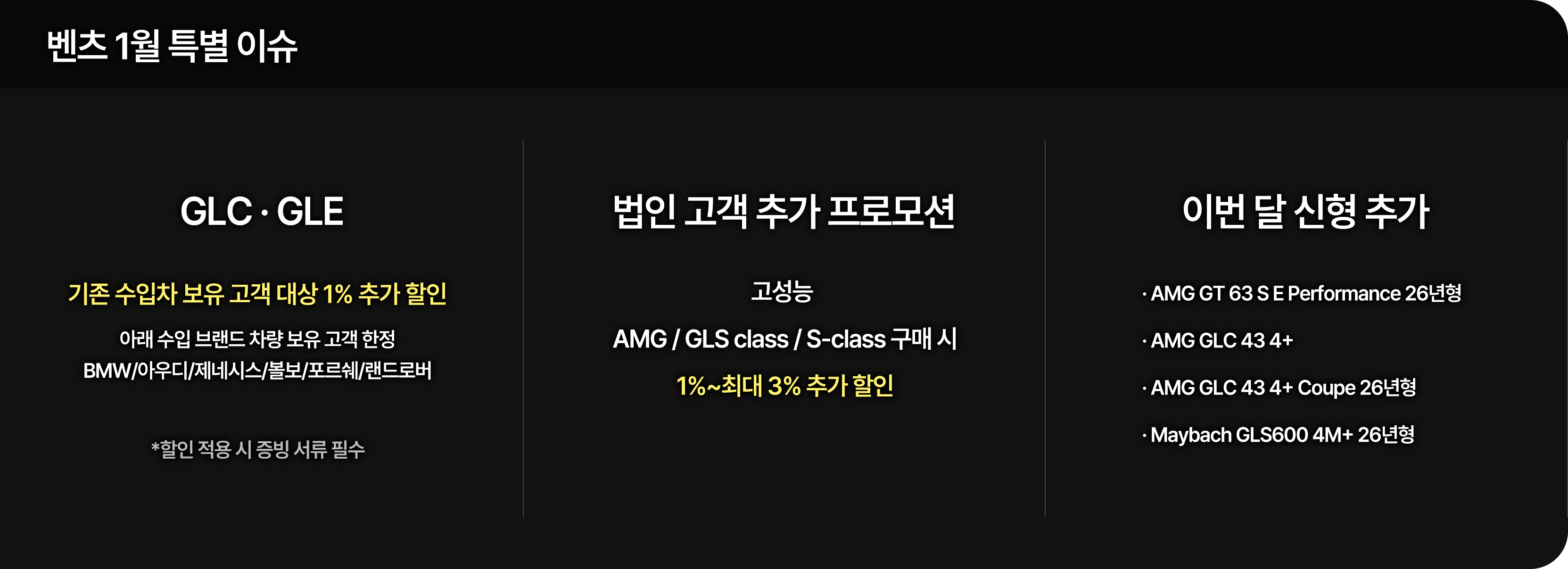 법인 고객을 대상으로 하는 1~3% 추가 프로모션 역시 벤츠의 핵심 전략입니다. 법인차 번호판 제도 도입 등 변화하는 시장 환경 속에서 사업자들에게 강력한 가격 경쟁력을 제안하며 법인 시장 내 지배력을 견고히 하고 있습니다.