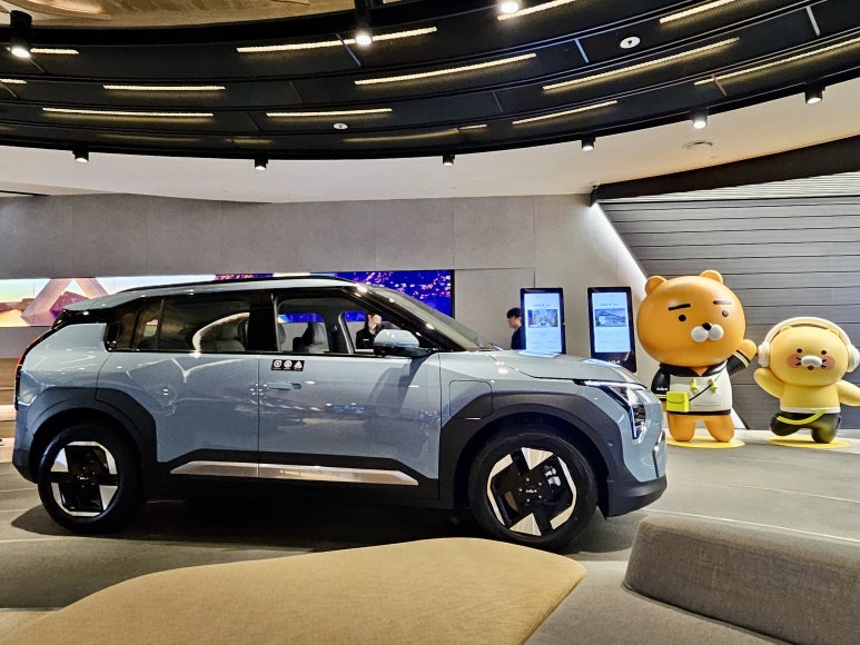 반면, 바로 옆에는 요즘 기아 전기차 라인업 중 가장 잘 나간다는 EV3가 전시되어 있습니다. 콤팩트한 사이즈에 알찬 공간감, 귀여운 디자인 덕분에 확실히 관람객들의 관심도 뜨거웠습니다.