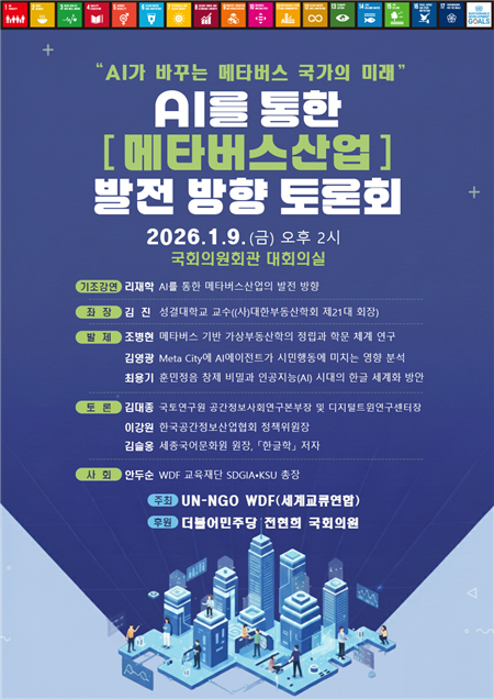 UN-NGO WDF(World Distribution Federation)는 2023년 유엔 경제사회이사회(ECOSOC) 특별자문지위를 승인받은 국제 비정부기구로, 이번 토론회를 통해 국내 메타버스 정책 논의를 국제적 의제로 확장하는 역할을 수행할 계획이다.