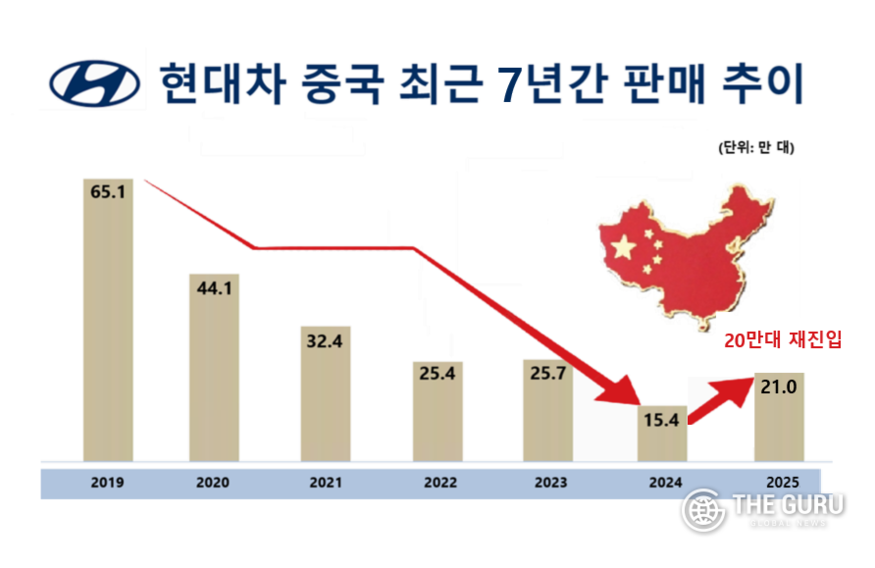 [더구루=정현준 기자] 현대자동차가 지난해 중국 시장에서 20만대 판매 '벽'을 넘었다. 현대차는 이재명 대통령의 중국 국빈 방문과 신에너지 신차 출시 확대를 계기로 올해 본격적인 중국 반등을 기대하고 있다.
