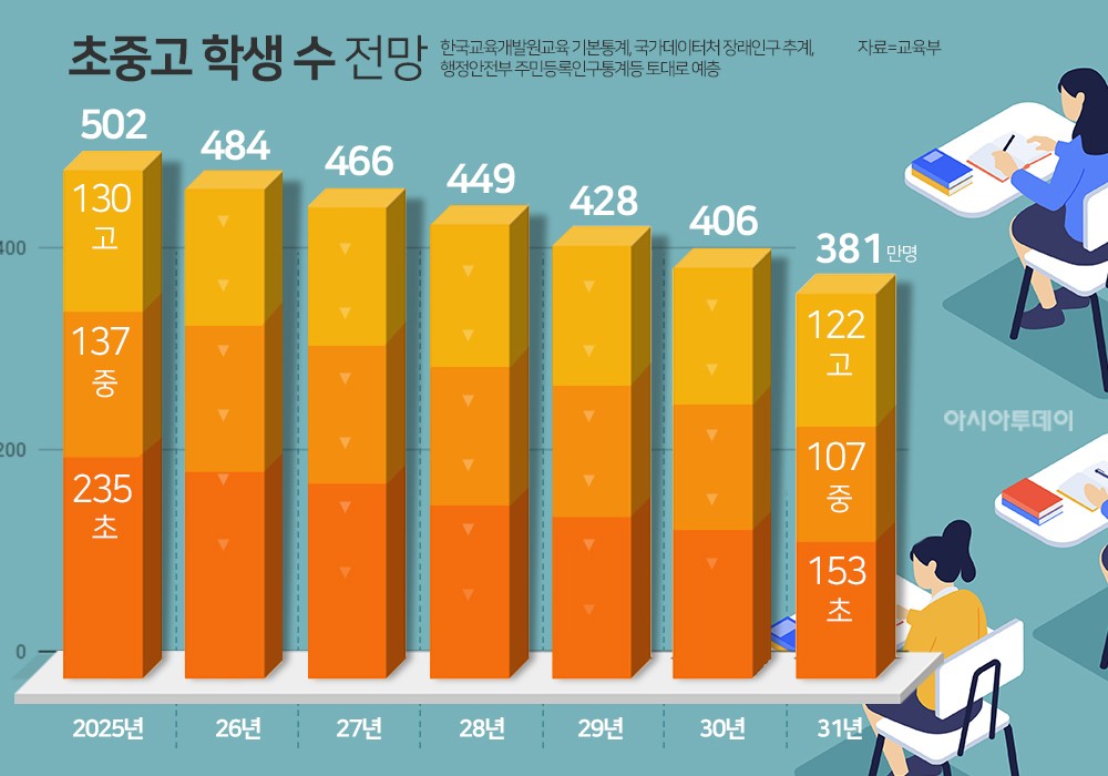 13일 교육부가 최근 공개한 '2025~2031년 초·중·고 학생 수 보정 추계'에 따르면 올해 전체 학생 수는 483만6890명으로 추산됐다. 지난해 505만1531명에서 21만4641명이 줄어들며 불과 1년 만에 500만명 선이 붕괴됐다.