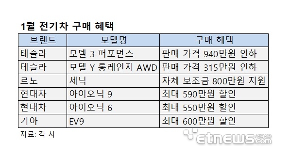 연초부터 국내 전기차 시장에서 가격 할인 경쟁이 본격화되고 있다. 완성차 업체들이 수백만원대 현금 할인과 자체 보조금 지원에 나서면서 내연기관차 대비 고가로 인식되던 전기차 구매 문턱이 크게 낮아질 전망이다.