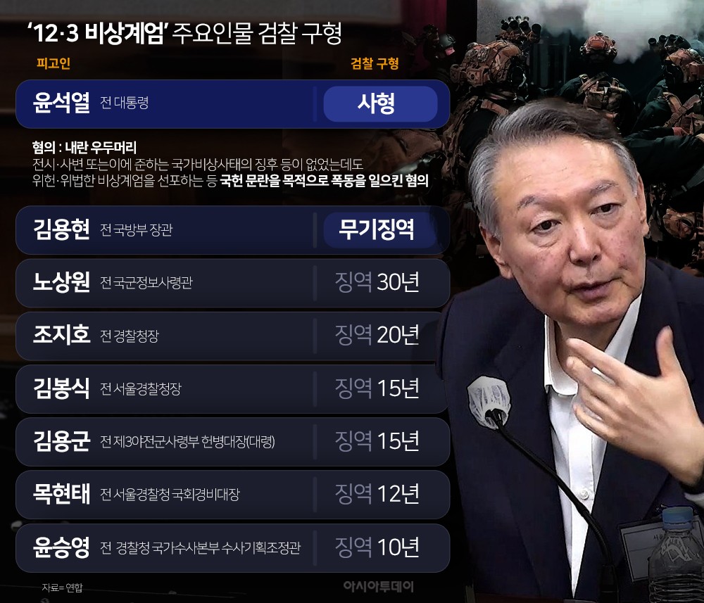 내란 특검팀은 13일 서울중앙지법 형사합의25부(지귀연 부장판사) 심리로 열린 윤 전 대통령의 내란 우두머리 혐의 결심 공판에서 이같이 선고해달라고 재판부에 요청했다. 내란 특검팀은 김용현 전 국방부 장관에게는 무기징역을, 노상원 전 정보사령관에겐 징역 30년을, 조지호 전 경찰청장에게는 징역 20년을 구형했다.