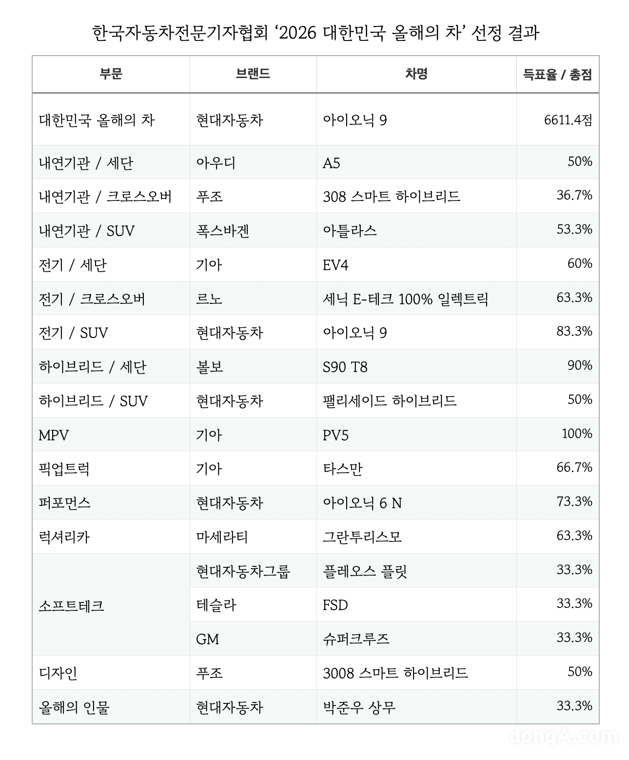 이와 함께 한국자동차전문기자협회는 총 16개 부문에서 수상작을 선정했다. 특히 올해는 ‘올해의 소프트테크’ 부문을 신설하며 인포테인먼트, 자율주행 등 소프트웨어와 하드웨어가 결합한 기술에 대한 평가가 이뤄졌다. 부문별 수상은 △대한민국 올해의 차 ‘현대자동차 아이오닉 9’ △올해의 내연기관 세단 ‘아우디 A5’ △올해의 내연기관 크로스오버 ‘푸조 308 스마트 하이브리드’ △올해의 내연기관 SUV ‘폭스바겐 아틀라스’ △올해의 전기 세단 ‘기아 EV4’ △올해의 전기 크로스오버 ‘르노코리아 세닉 E-테크 100% 일렉트릭’ △올해의 전기 SUV ‘현대자동차 아이오닉 9’ △올해의 하이브리드 세단 ‘볼보 S90 T8’ △올해의 MPV ‘기아 PV5’ △올해의 픽업트럭 ‘기아 타스만’ △올해의 퍼포먼스 ‘현대자동차 아이오닉 6 N’ △올해의 럭셔리카 ‘마세라티 그란투리스모’ △올해의 디자인 ‘푸조 3008 스마트 하이브리드’가 선정됐다. 올해의 인물에는 현대자동차그룹에서 N브랜드를 담당하는 박준우 상무가 선정됐다.