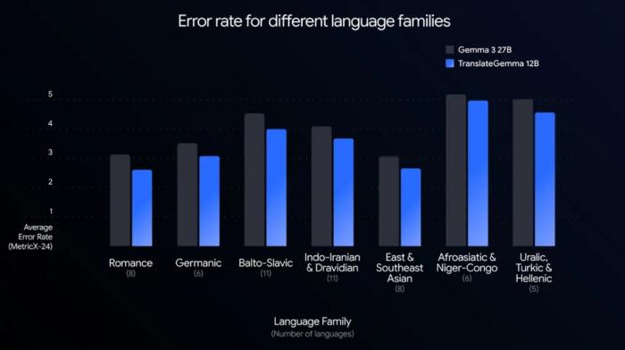 트랜스레이트젬마의 개선 효과는 사용자가 적은 언어 조합에서 특히 두드러졌다. 영어-마라티어는 1.6포인트 좋아졌고, 영어-스와힐리어나 체코어-우크라이나어는 1.0포인트 개선되었다.