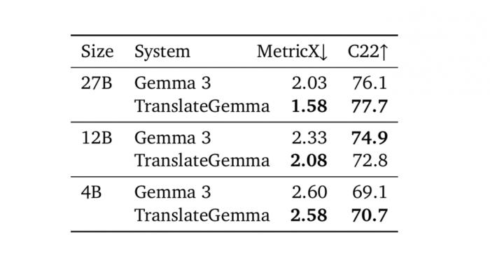 트랜스레이트젬마는 55개 언어 번역을 평가하는 WMT24++ 테스트에서 검증받았다. 가장 큰 270억 개 규모 모델의 경우 평가 점수가 4.04에서 3.09로 낮아졌다. 점수가 낮을수록 번역 품질이 좋다는 의미이므로, 약 23.5%나 개선된 셈이다. 120억 개 규모 모델은 4.86에서 3.60으로 25.9% 개선되었고, 40억 개 규모 모델은 6.97에서 5.32로 23.6% 개선되었다.