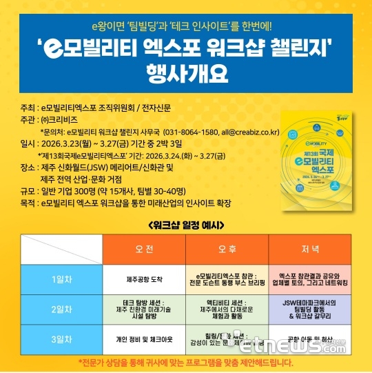 최근 성황리에 폐막된 2026년 라스베이거스 CES가 e모빌리티의 글로벌 기술 트렌드를 제시한 가운데, 이러한 흐름을 '현실 적용과 산업 확산' 관점에서 직접 확인할 수 있는 제13회 국제 e모빌리티 엑스포가 오는 3월 제주에서 개최된다. 이에 맞춰 엑스포 조직위원회는 국내 기업 및 기관 임직원을 대상으로 한 'e모빌리티 도슨트 워크숍 챌린지”를 공식 론칭하고 참가 기업 모집에 나섰다.