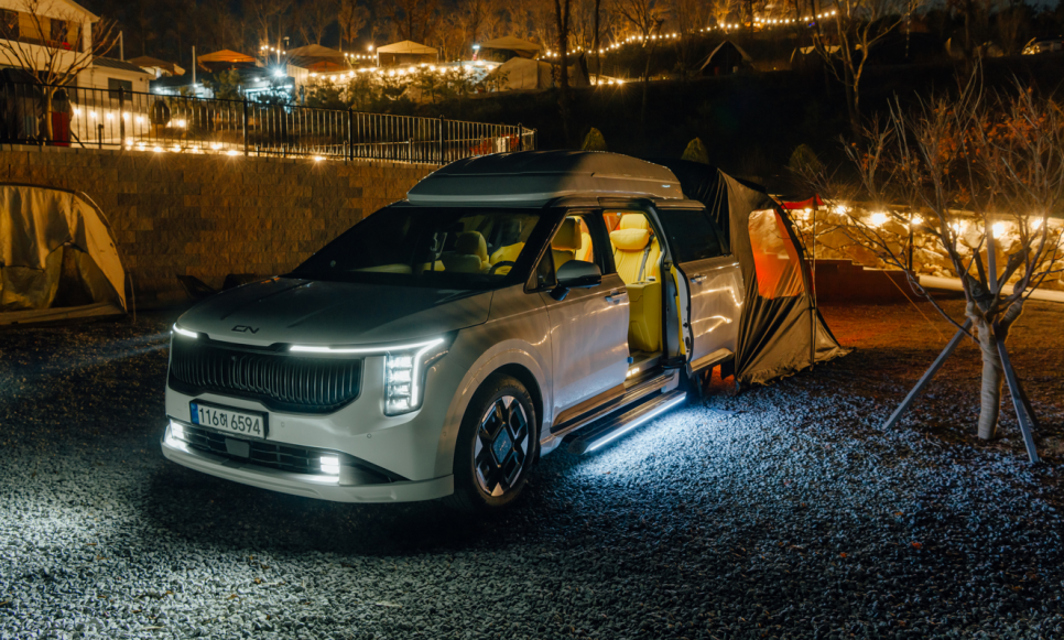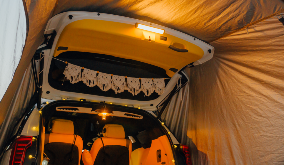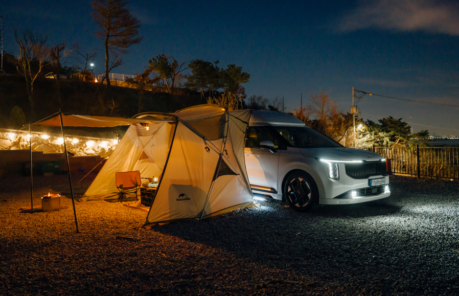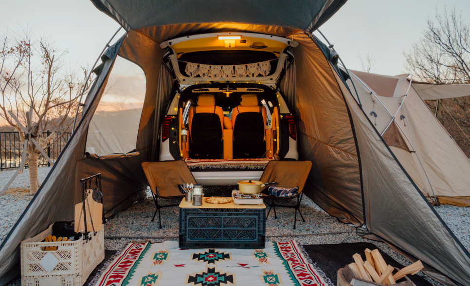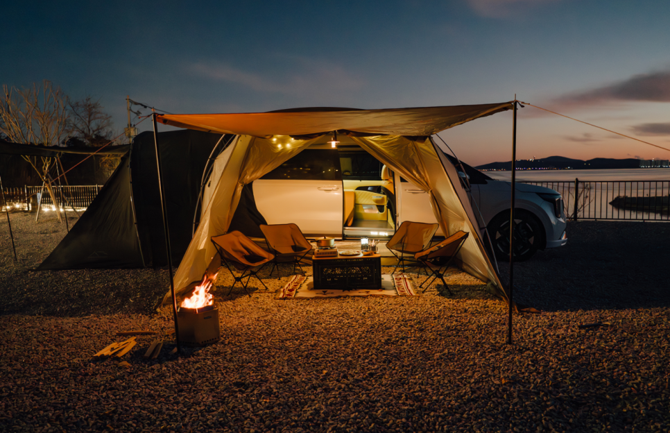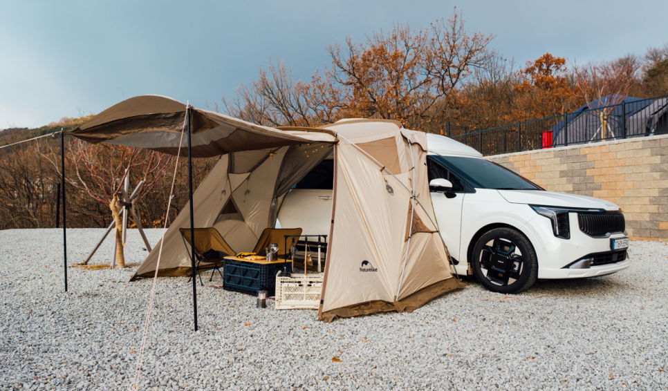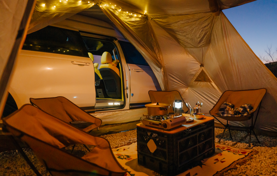 CN모터스 카니발 하이리무진 3열에는 시트를 탈거할 수 있어 짐을 보다 많이 실을 수 있었죠. 그리고 후면 텐트를 설치하고 캠핑 의자와 테이블, 러그 등 간단한 캠핑 용품만 배치했는데 벌서 낭만적이죠. 사이트 텐트는 파워 슬라이딩 도어를 활용해 쉽게 칠 수 있는데요. 텐트와 차량이 일체감 있는 공간감이 좋았어요. 또한 CN모터스 카니발 하이브리드는 야외에서도 핸드폰을 통해 음악을 재생하거나 영상을 시청할 수 있는 통합제어시스템까지 갖추고 있어 한층 더 캠핑의 질이 올라간 것 같은 기분이 들었어요.