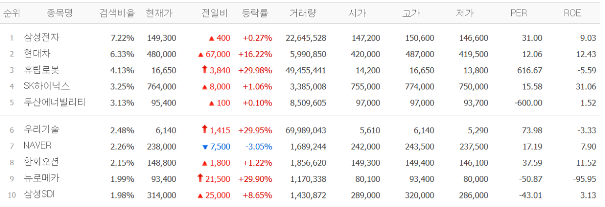 20일 금융투자업계에 따르면 이날 장 시작 전 네이버페이증권 검색 상위 종목은 삼성전자, 현대차, 휴림로봇, SK하이닉스, 두산에너빌리티 등이다. 피지컬 AI와 로봇 테마를 중심으로 반도체와 에너지 종목까지 관심이 확산됐다.