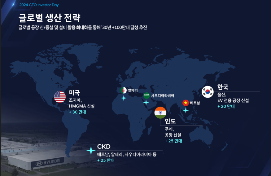 같은 해인 8월 열린 CEO 인베스터데이(CEO Investor Day)에서는 오는 2030년까지 글로벌 생산능력 100만대 추가 확보하는 전략이 발표됐다. 알제리를 포함한 베트남, 사우디아라비아 등 주요 신흥시장 반조립 공장(CKD) 설립계획도 포함됐다.