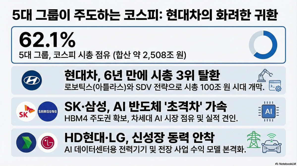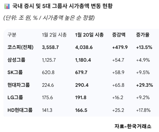 연초부터 요동치는 시총 순위, 현대차ㆍHD현대 급등⋯5대 그룹주 비중 62%