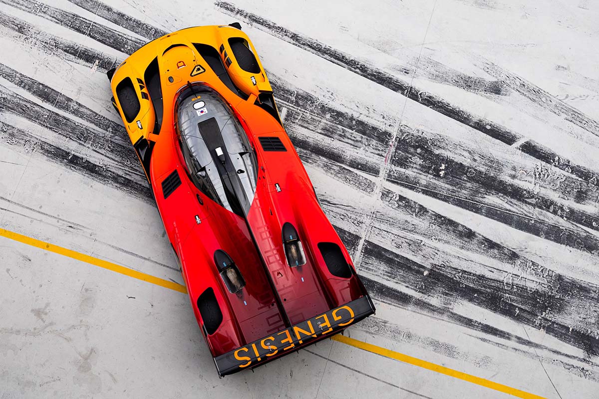 함께 전시된 GMR-001 하이퍼카는 제네시스 마그마 레이싱팀이 실제 경기에 출전할 차량의 디자인 모델이다. 모터스포츠 분야를 향한 제네시스의 도전 의지를 상징한다.