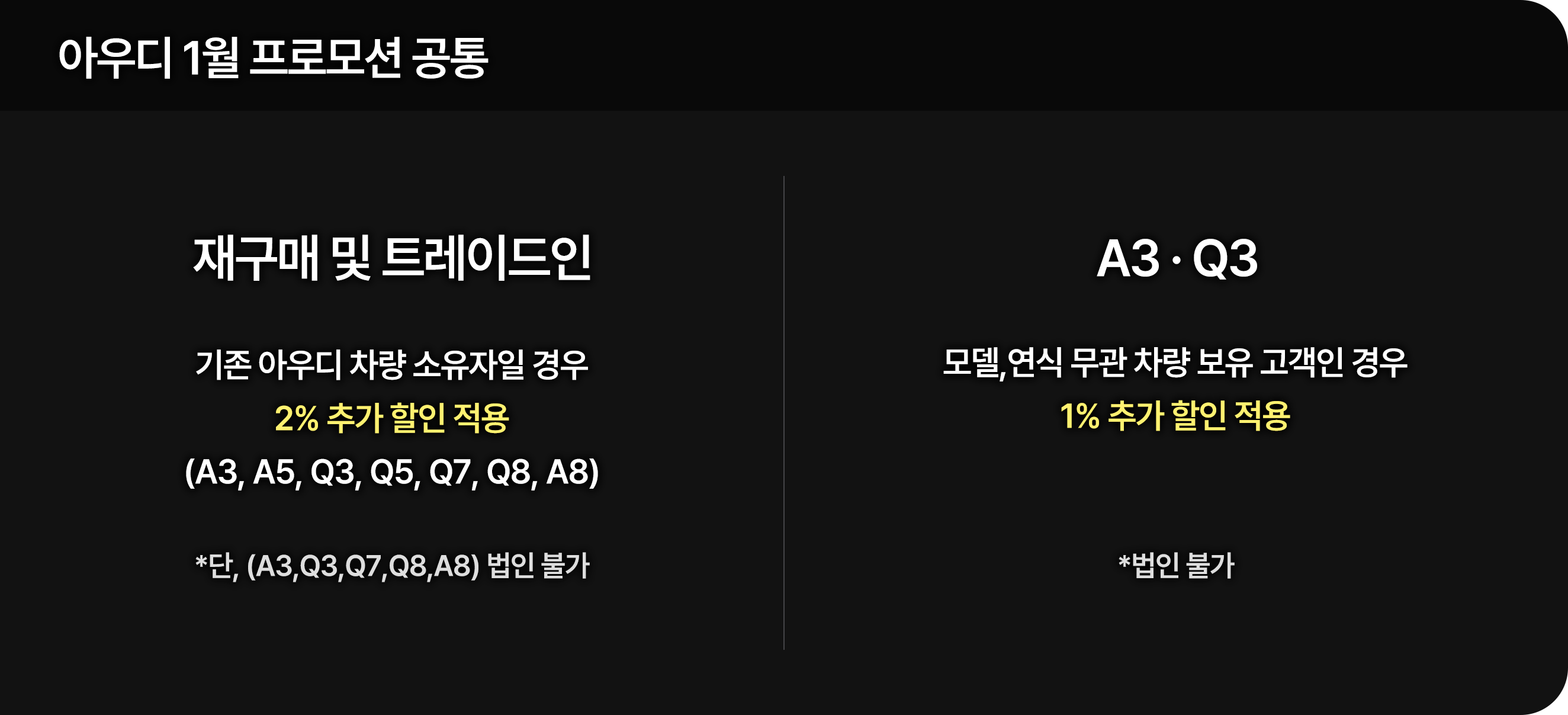 기업 고객을 위한 특화 혜택은 아우디의 전문적인 비즈니스 파트너십을 보여줍니다. 법인 명의 진행 시 Q7과 Q8 모델은 1%의 추가 할인과 더불어 취등록세 지원 혜택이 병행됩니다. 또한 기존 아우디 오너를 위한 재구매 및 트레이드인 2% 추가 할인은 브랜드 로열티를 강화하는 핵심적인 26년1월아우디프로모션 요소입니다.