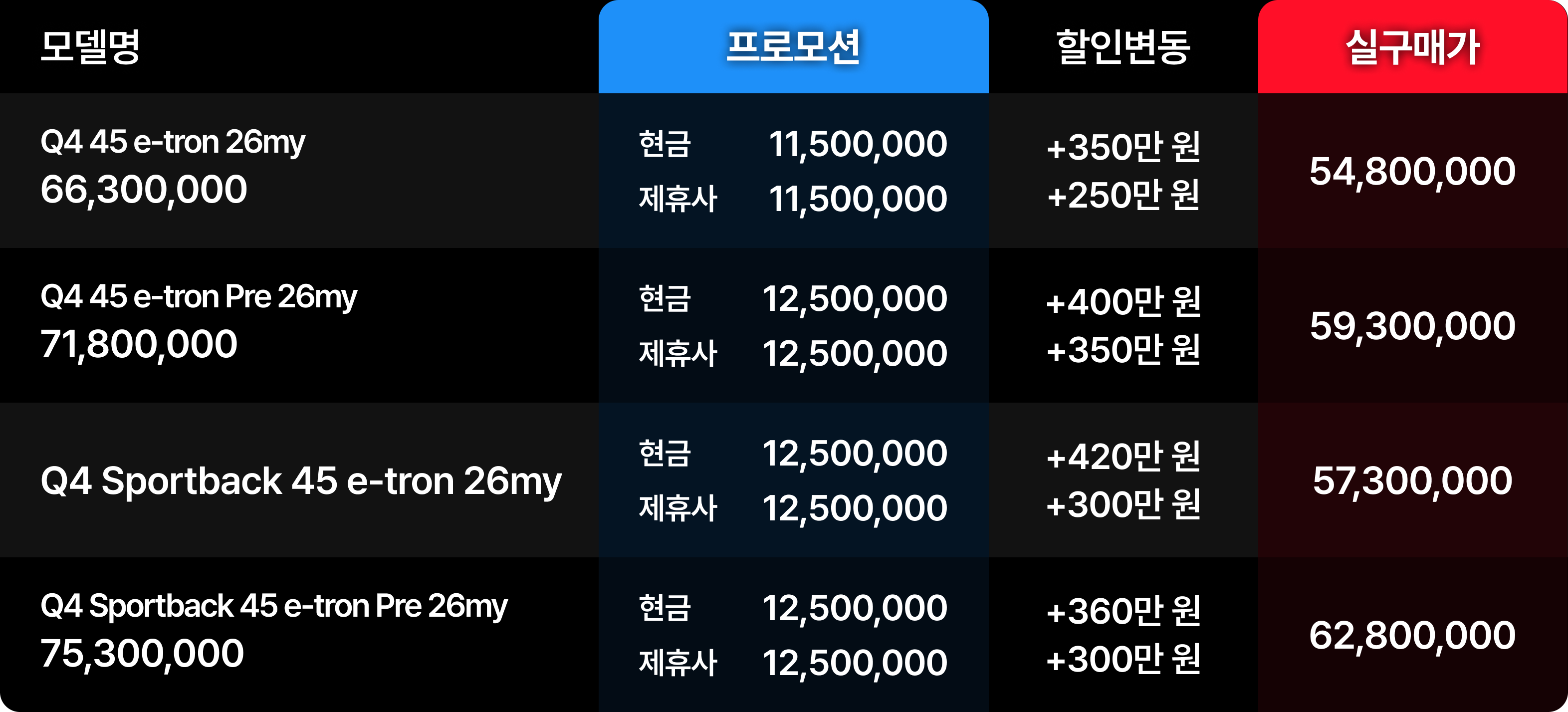 가장 주목해야 할 모델은 아우디 Q4 e트론 라인업입니다. 합리적인 가격대와 프리미엄 브랜드의 가치를 동시에 제공하며 수입 전기차 대중화를 이끄는 포지션입니다. 26년1월아우디할인 정책의 변화를 살펴보면 아우디 코리아가 올해 초 시장 점유율을 확실히 선점하겠다는 공격적인 의지가 투영되어 있음을 알 수 있습니다.