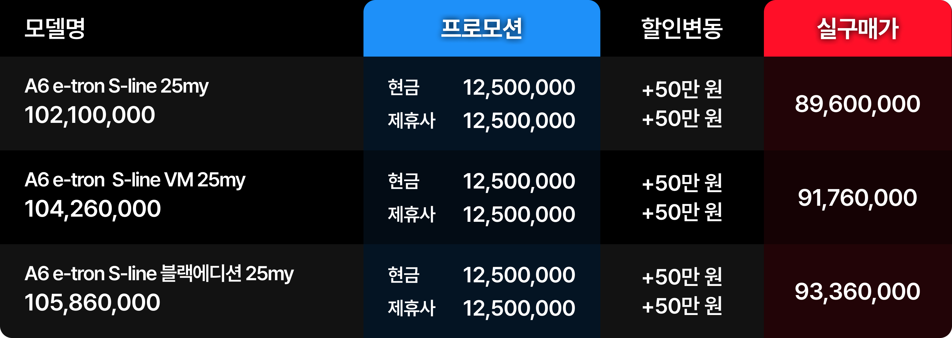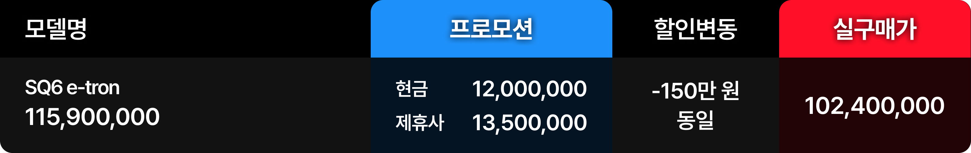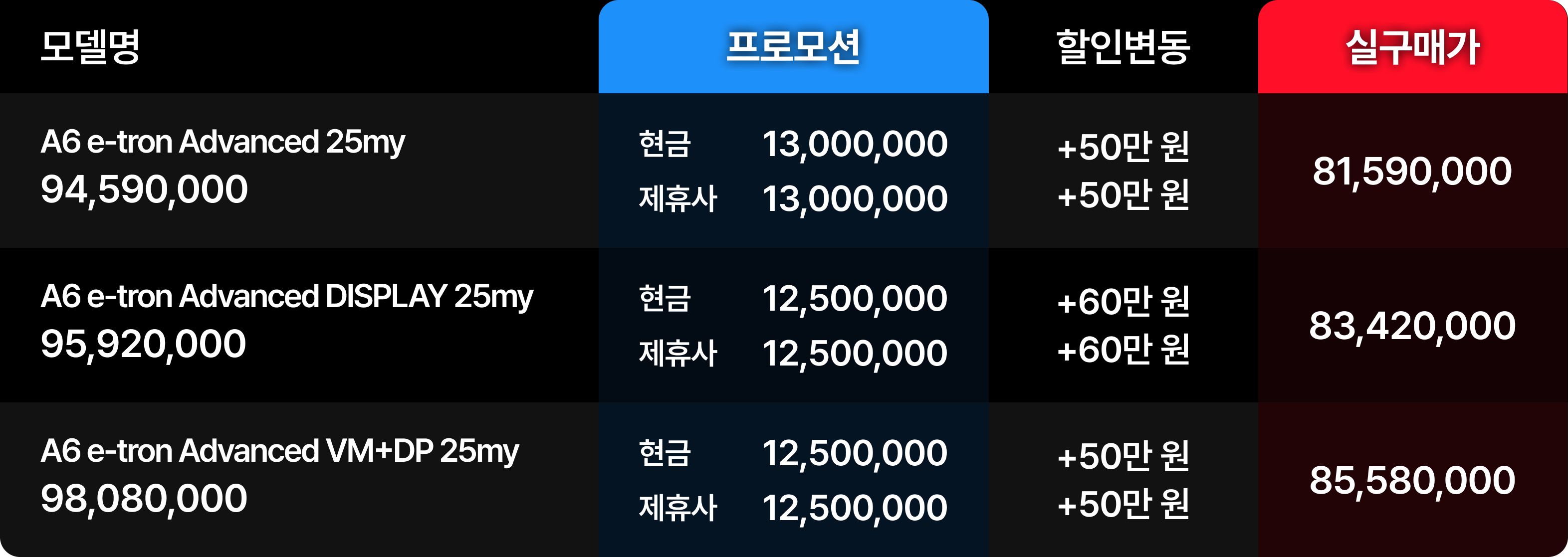 반면 아우디 Q6 e트론 차량의 26년1월아우디할인 폭은 전월 대비 1,500,000원이 하락한 상태입니다. 공급 물량 조절과 시장 수요에 따른 전략적 후퇴로 보이며 26년1월아우디프로모션 금액은 현금 12,000,000원 수준입니다. 신규 모델로서의 가치를 보호하기 위한 아우디 코리아의 정책적인 선택으로 풀이됩니다.