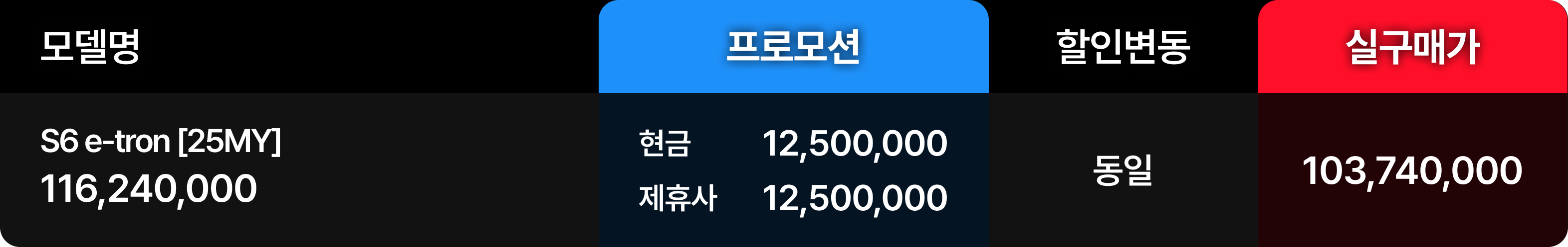이번 달 아우디 S6 e트론 차량의 할인 조건은 전월과 동일하게 고정되어 있습니다. 현금과 제휴사 모두 12,500,000원의 프로모션을 제공하며 최종 실구매가는 103,740,000원입니다. 26년1월아우디할인 시장에서 변동은 없으나 여전히 천만 원 이상의 높은 26년1월아우디프로모션 혜택을 유지하며 마니아들을 유혹하고 있습니다.