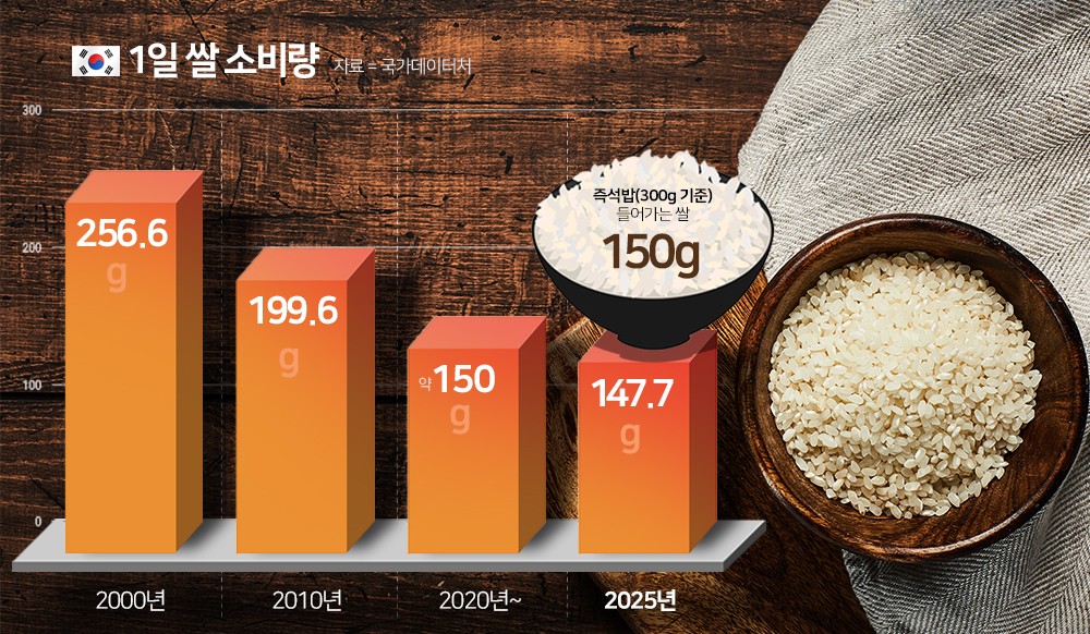 1일 쌀 소비량은 매년 감소하는 추세다. 2000년(256.6g)에는 250g을 넘었지만 2010년(199.6g)에 200g 아래로 떨어졌다. 이후 2020년대 들어 150g대에서 하락세가 이어지다 지난해 140g대에 진입했다.