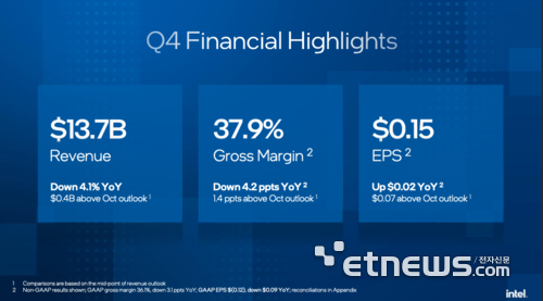 인텔은 4분기 매출액이 지난해 같은 기간 대비 4% 감소한 137억 달러(약 20조원)를 기록했다고 22일(현지시간) 밝혔다.
