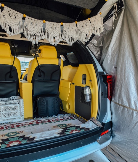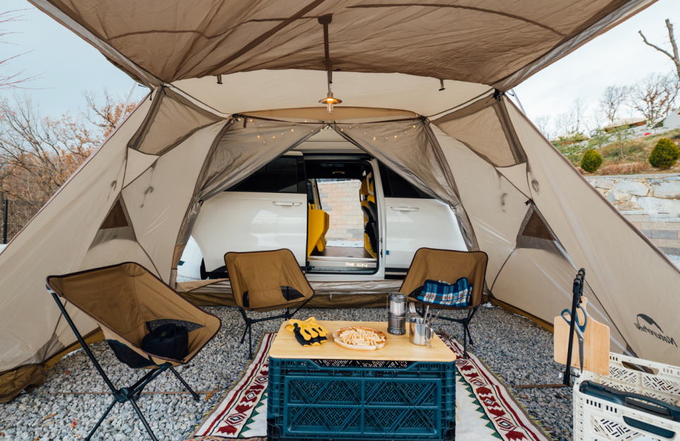 CN모터스 카니발 하이리무진은 사용 환경에 따라 3열 시트를 분리해 많은 짐들을 더 여유롭게 실을 수도 있습니다. 캠핑장에 도착해서 카니발 하이브리드 후면 텐트를 설치하고 테이블과 의자만 놓았는데 캠핑 낭만이 느껴집니다. 여기에 파워 슬라이딩 도어를 활용해 사이드 텐트도 설치했는데요. 카니발 하이브리드 차량 실내와 일체감 있는 공간감이 매력적이었죠. 야외에서는 CN모터스 카니발 하이브리드 통합제어시스템을 통해 핸드폰으로 음악을 틀거나 영상을 볼 수 있어 한층 더 캠핑의 즐거움을 더했습니다.