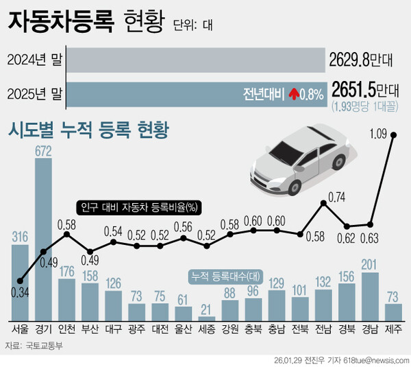 인구 대비 자동차 등록비율은 제주가 가장 높았으며, 인구 1명당 자동차 보유 대수는 서울이 가장 많은 것으로 나타났다.