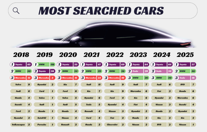 [더구루=정현준 기자] 현대자동차와 기아가 지난해 글로벌 검색량 기준 '세계에서 가장 많이 검색된 자동차 브랜드 톱10'에 나란히 올랐다. 기아는 전년과 같은 순위를 유지했지만, 현대차는 두 계단 하락했다. 그럼에도 양사는 남미와 중동 시장에서 브랜드 영향력을 확대하며 글로벌 존재감을 확인했다.